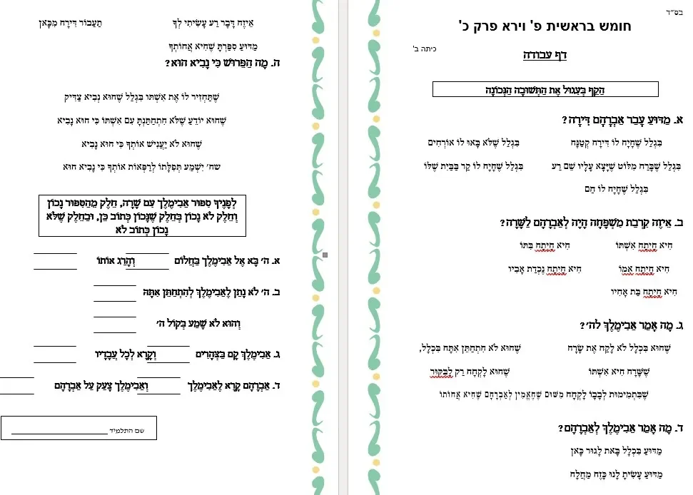 דף עבודה בהבנת הנקרא – פ' וירא פרק כ' (2)