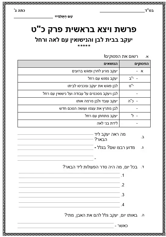 דף עבודה – הבנה – פרשת ויצא – יעקב בבית לבן והנישואין עם לאה ורחל
