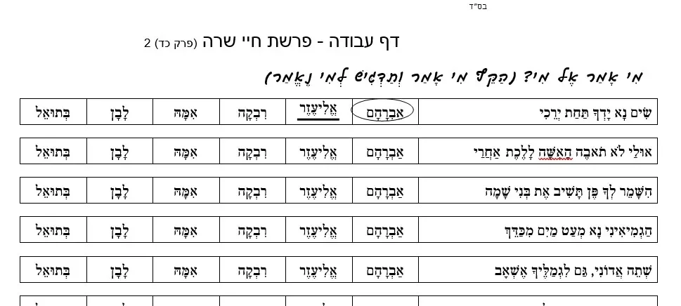 דף עבודה הבנת הנקרא – פרשת חיי שרה פרק כד 2 – מִי אָמַר אֶל מִי