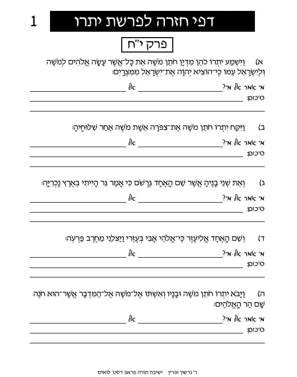 דפי חזרה לפרשת יתרו