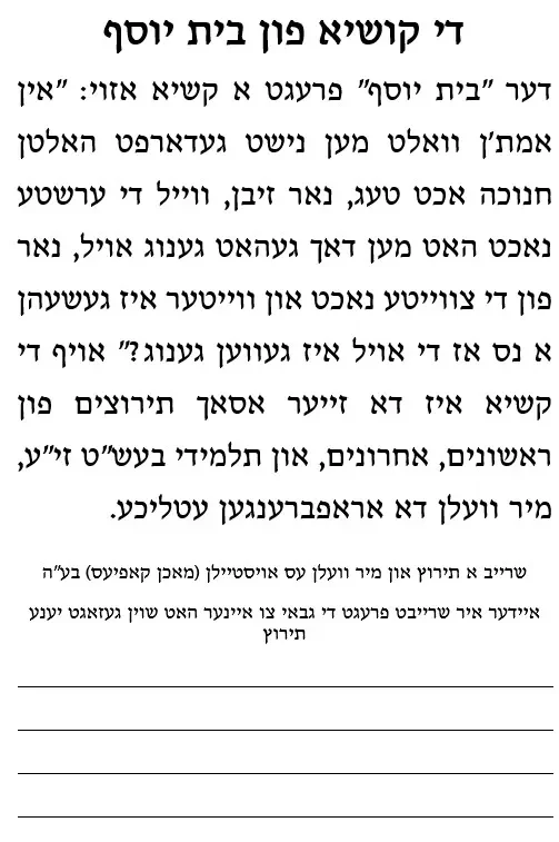 דף תוכן לקריאה – די קושיא פון בית יוסף – חנוכה