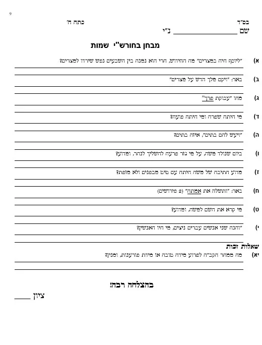 מבחן 11 שאלות בחומרש"י – פרשת שמות