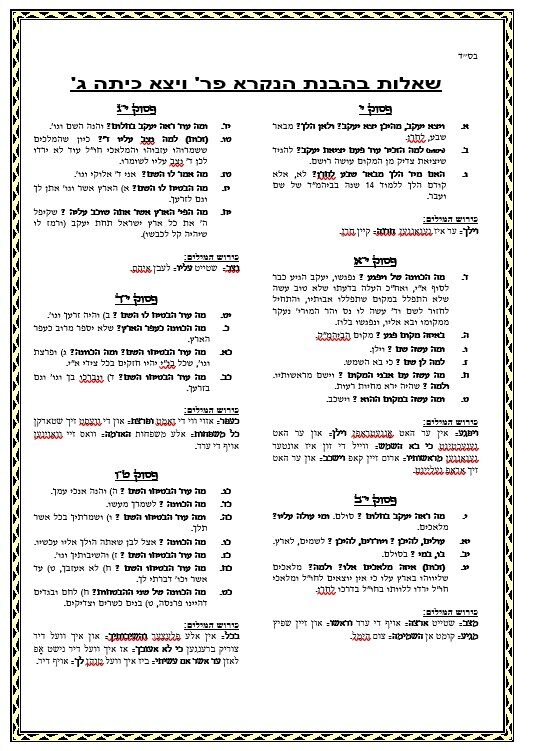 שאלות בהבנת הנקרא פר' ויצא כיתה ג